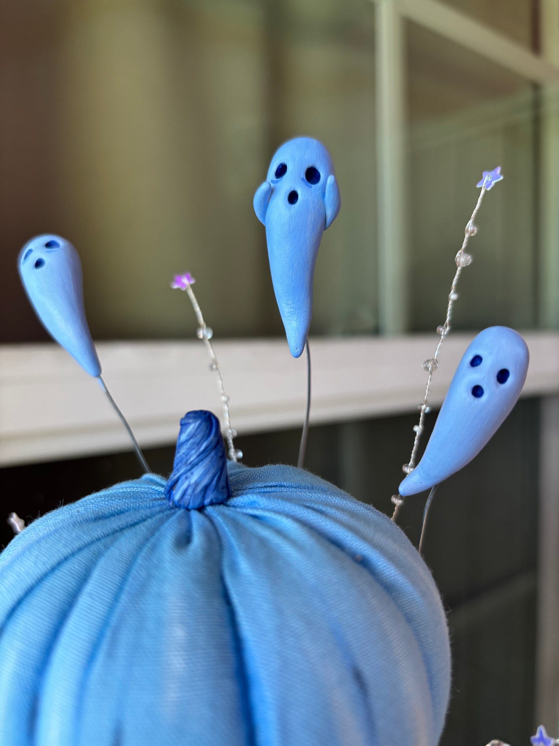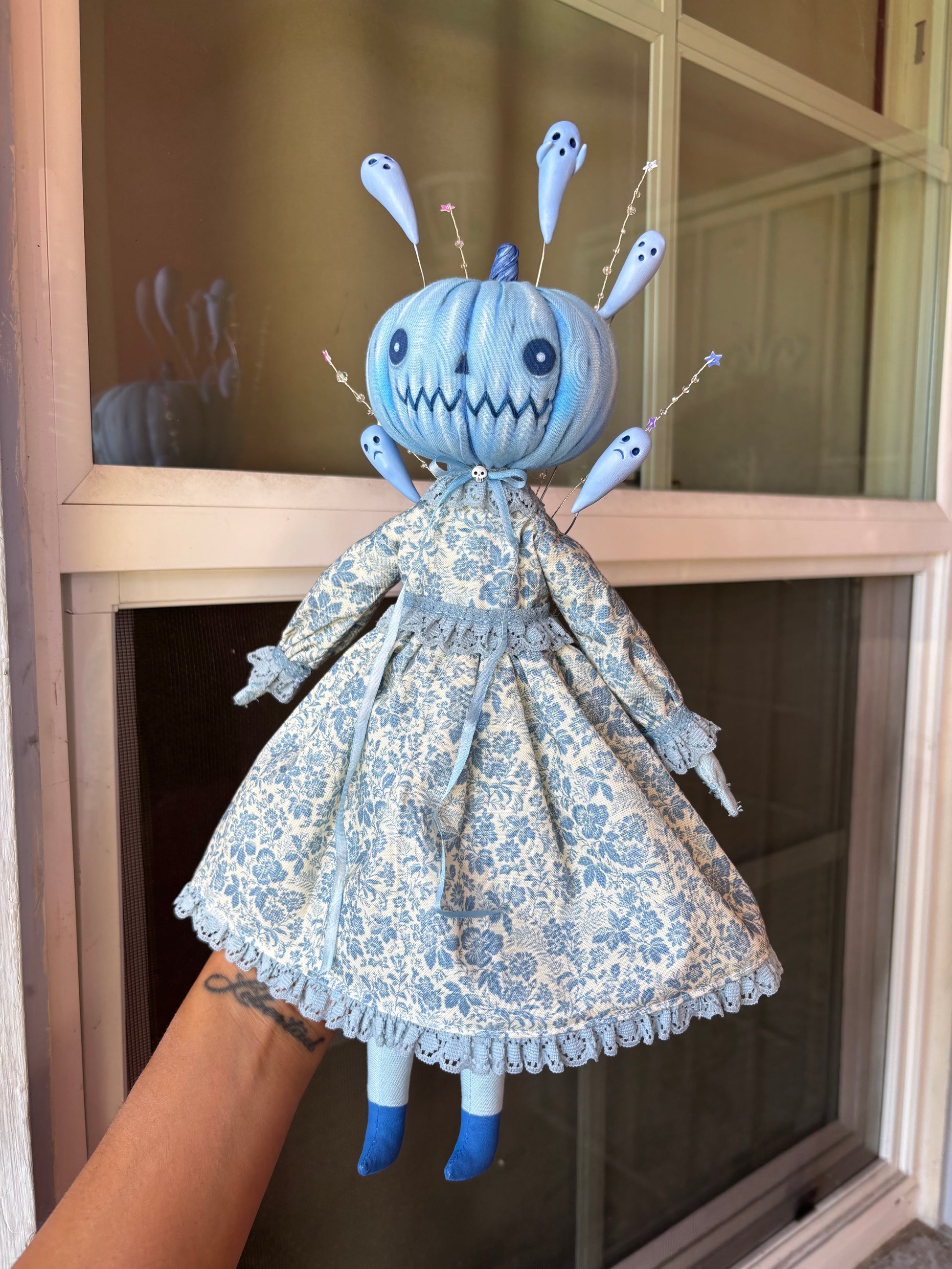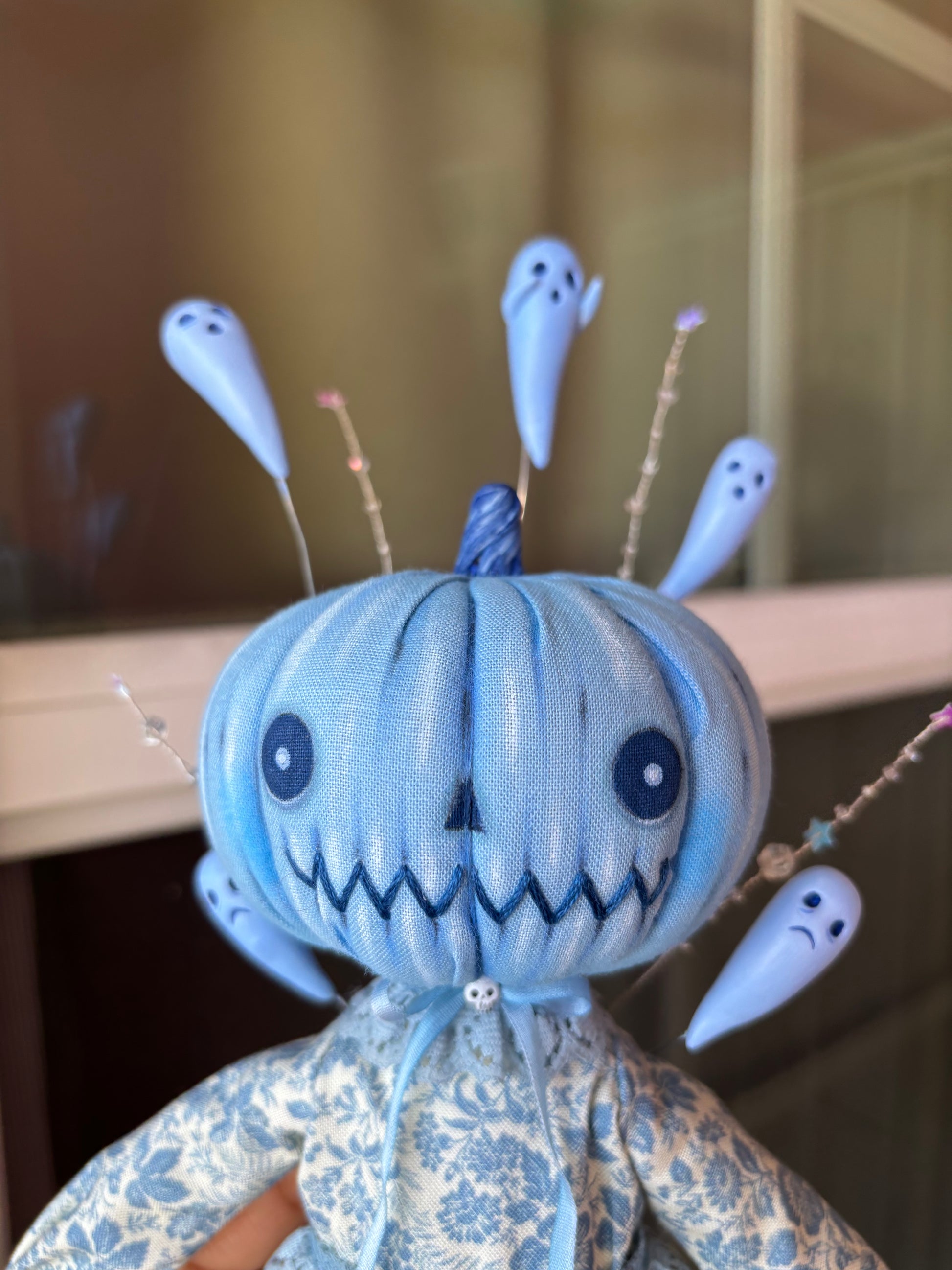 This dolls body is made out of kona cotton and is stuffed with eco wool. The face was achieved with acrylic paint, color pencils and embroidery thread. The ghosts are made out of magic sculpt clay and wire. The outfit is made out of cotton and is not removable. This doll measures approx 14 1/2 inches from top of tallest ghost to feet.